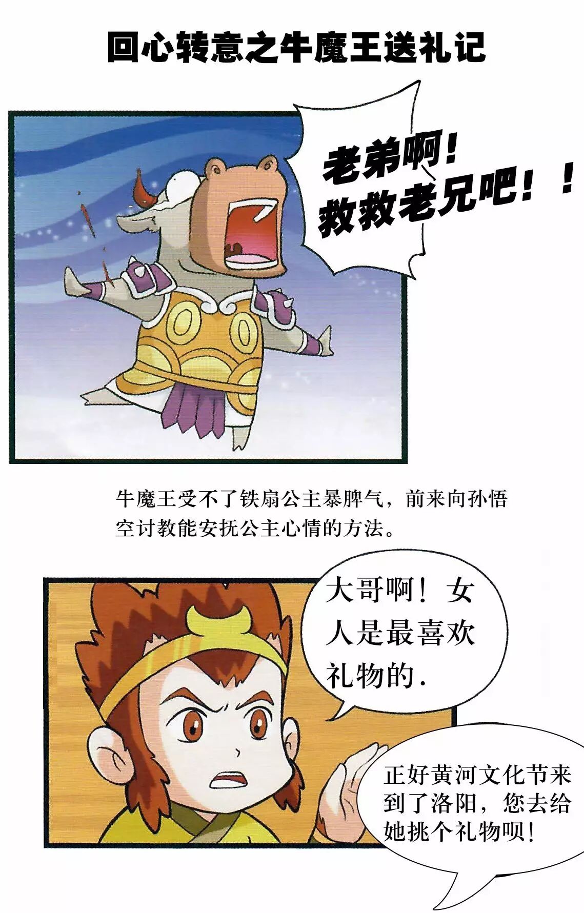 上回说道:在去往洛阳黄河文化节途中,听闻金光寺里有一个镇塔之宝,悟空携八戒去一探究竟,发现原来宝物是开瑞汽车。后来又遇上拜把子兄弟牛魔王前来向悟空求救,牛魔王遇到什么难言之隐呢?