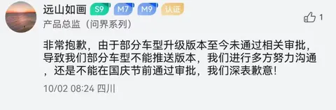 据媒体报道,问界汽车近日通过鸿蒙智行App发布致歉声明,解释了因未获相关审批,部分车型的ADS4.0智能驾驶系统升级未能按计划在国庆前推送的原因。尽管公司方面多方努力沟通,但由于审批流程未能在假期前完成,车主们暂时无法体验这一备受期待的新功能。最受影响的车型为问界M7。而这一“推迟”不仅仅是一个技术问题,更折射出整个行业在智能驾驶系统升级中的一个更大、更棘手的隐忧。