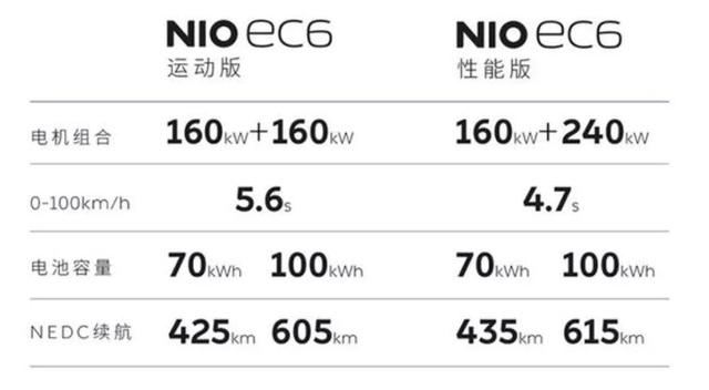 与此同时,蔚来EC6共推出两种动力版本(运动版和性能版),运动版采用的是双160kW永磁同步电机,性能版则采用160kW前永磁同步电机+240kW后异步感应电机。运动版和性能版均可选择容量为70kWh的电池包或容量为100kWh的电池包,最终能搭配出四种NEDC续航里程,分别为425km、605km、435km和615km。