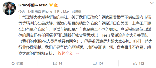 事件发生后,特斯拉方面马上做出了反应,特斯拉对外事务副总裁陶琳女士在微博上对公众进行了回应。陶琳女士称,把改款车辆卖到香港而不供应中国大陆市场的猜想是对特斯拉的误解。香港在售的右舵车由美国工厂生产并进口,上海工厂目前还没有量产右舵车。测试车辆和量产车也是完全不同的概念。