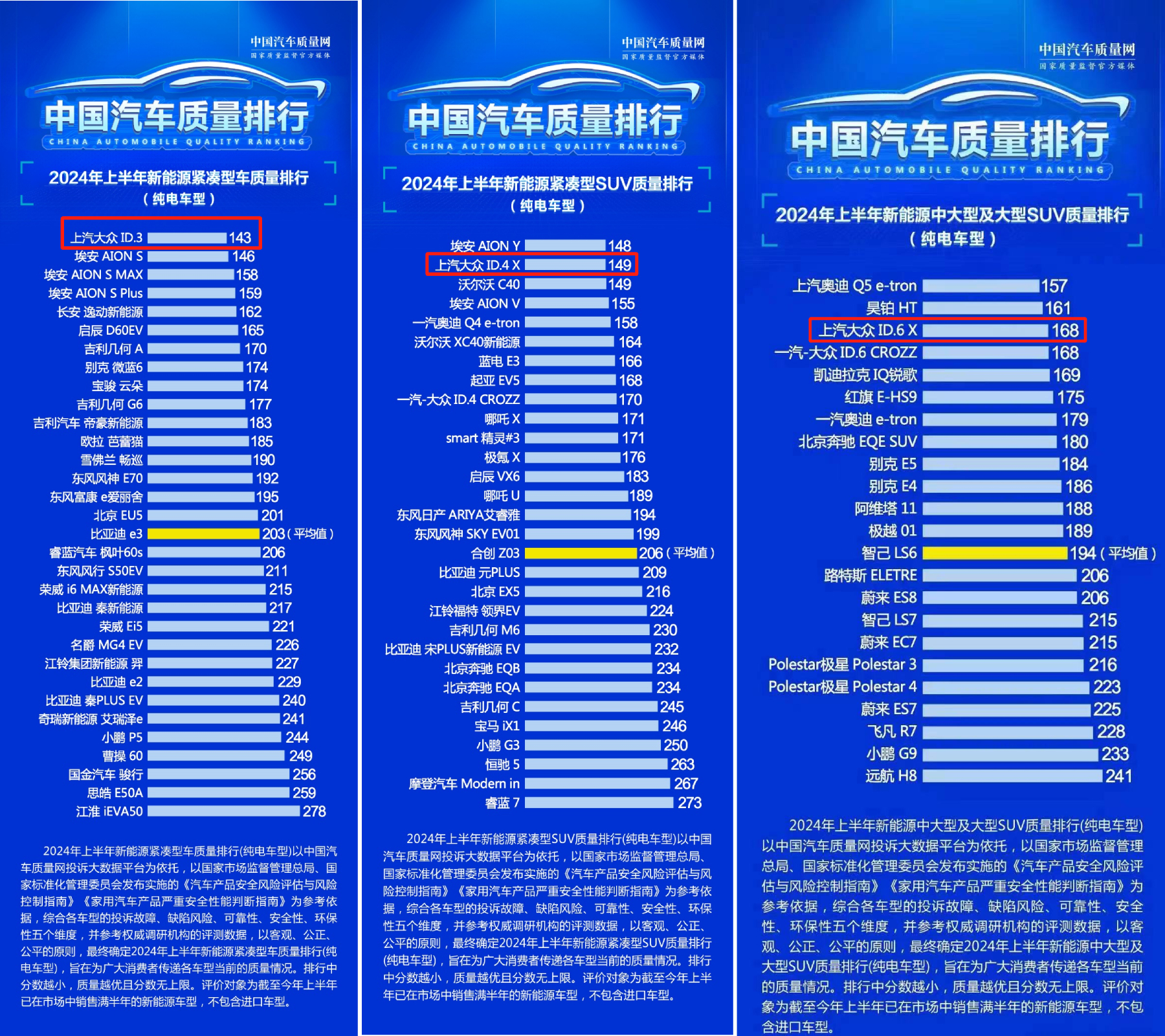 凭借德系驾控基因、强大的三电系统以及出众的可靠性等固有优势,ID.家族兼具高品质与高性价比,在纯电消费群体中广受好评,用户认同感也越来越强。近日,2024年上半年中国汽车质量排行榜公布,ID.3、ID.4 X和ID.6 X均在各细分榜单名列前茅,ID.3更是高居纯电紧凑型车榜首。权威机构严选,品质更有保障。