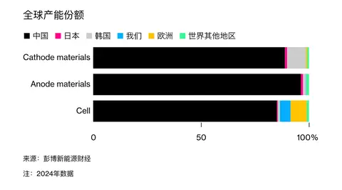 中国在全球电池产业中占据关键位置。根据彭博新能源财经(BNEF)的数据,中国生产的电网级锂离子电池占美国进口的65%。这一巨大市场份额使得中国在全球电池供应链中具有不可替代的地位。电池产业不再仅仅是“中国产品”,而是全球能源转型中的战略核心。