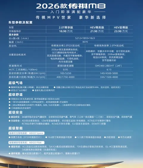本次上市的2026款传祺M8 2.0T仅推出尊享版一款配置,真正实现入门即满配、起步即旗舰,彻底告别繁琐选装与配置纠结。