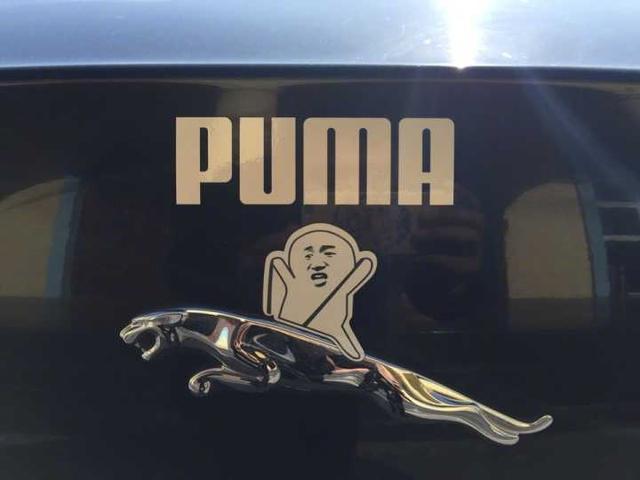 捷豹的车标经常都被玩坏,以前就有车主在冬天的时候给立标穿上一件小衣服,而这个尾标就变成了“我们走,PUMA”,???豹子内心估计也是崩溃的。
