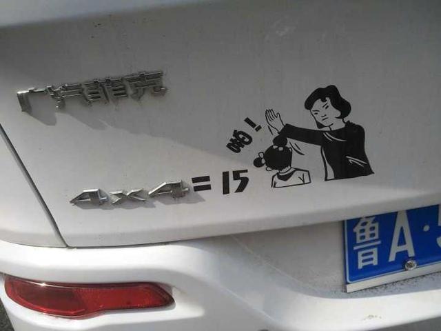 妈妈再打我一次,这位车主再车尾的4X4后面加了等于15,也是脑洞打开,给孩子看一看,估计这辈子都不敢算错4X4,否则妈妈要赏耳光了。