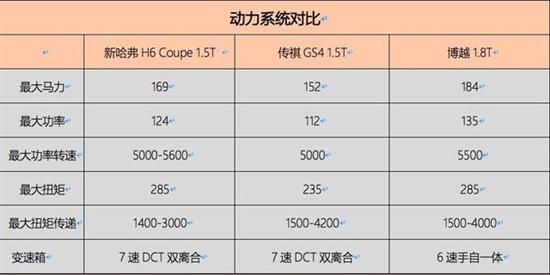 从上表可以看出,新哈弗H6 Coupe1.5T的最大马力、最大功率和最大扭矩基本和博越的1.8T处于同一水准,最大扭矩的数值甚至是完全相同,但如果考虑到两者的排量差距,显然新哈弗H6 Coupe的燃油经济性要更高一些。相比来说,GS4的整体数据都要落后一截。