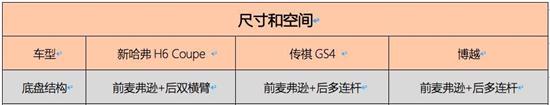 从上表我们可以看到,新哈弗H6 Coupe在长度和轴距上具有比较明显的优势,长车身能带来更为大气的视觉效果,大轴距则能够提供更宽敞的纵向空间,实用性更高;GS4在宽度和高度上略有优势,但只多出几毫米,在实际乘坐体验上难以感受到明显差别,博越则整体表现平平。就空间而言,新哈弗H6 Coupe显然更胜一筹。