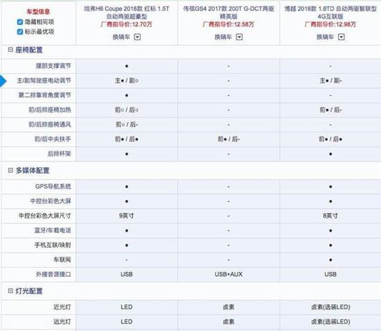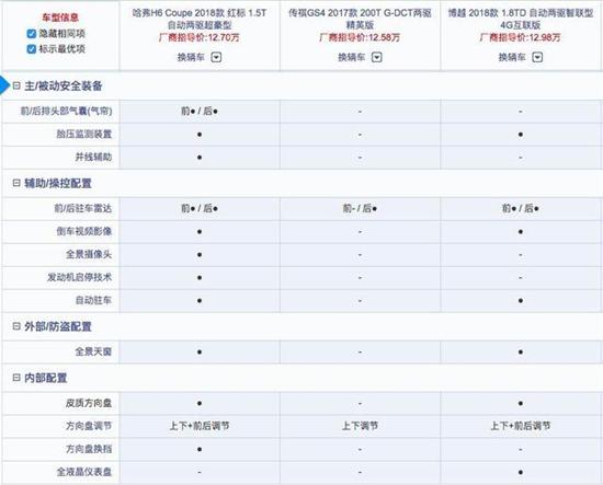 从上表可以看出,三者的配置差异还是比较明显的。首先,从数量上看,新哈弗H6 Coupe配置更加齐全,像前后头部气囊、并线辅助、全景摄像头、发动机启停、腰部支撑、第二排座椅靠背角度调节、LED大灯、后视镜电动折叠、感应雨刷这些配置,都是其他两款车不具备的;而博越则在配置数量紧随其后,前排座椅加热、车联网这些配置也可圈可点,相比之下,GS4的配置就显得 比较寒酸了。