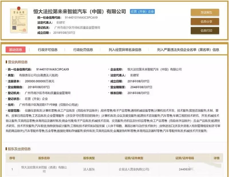 8月7日恒大法拉第未来智能汽车(中国)有限公司在广州注册成功,出资方是恒大法拉第未来控股(香港)有限公司。