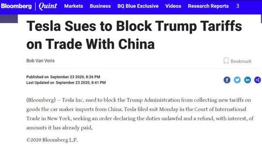 彭博社9月23日报道指出,美国电动汽车制造商特斯拉在纽约的国际贸易法院正式起诉美国政府和美国贸易代表莱特希泽。特斯拉提交的诉状表明,特斯拉要求认定美政府对该公司从中国进口的部分零部件征收关税是违法的,并退还已支付的关税及相应利息。