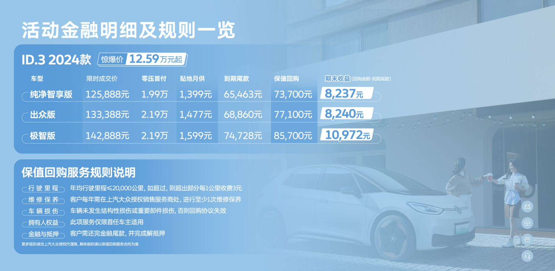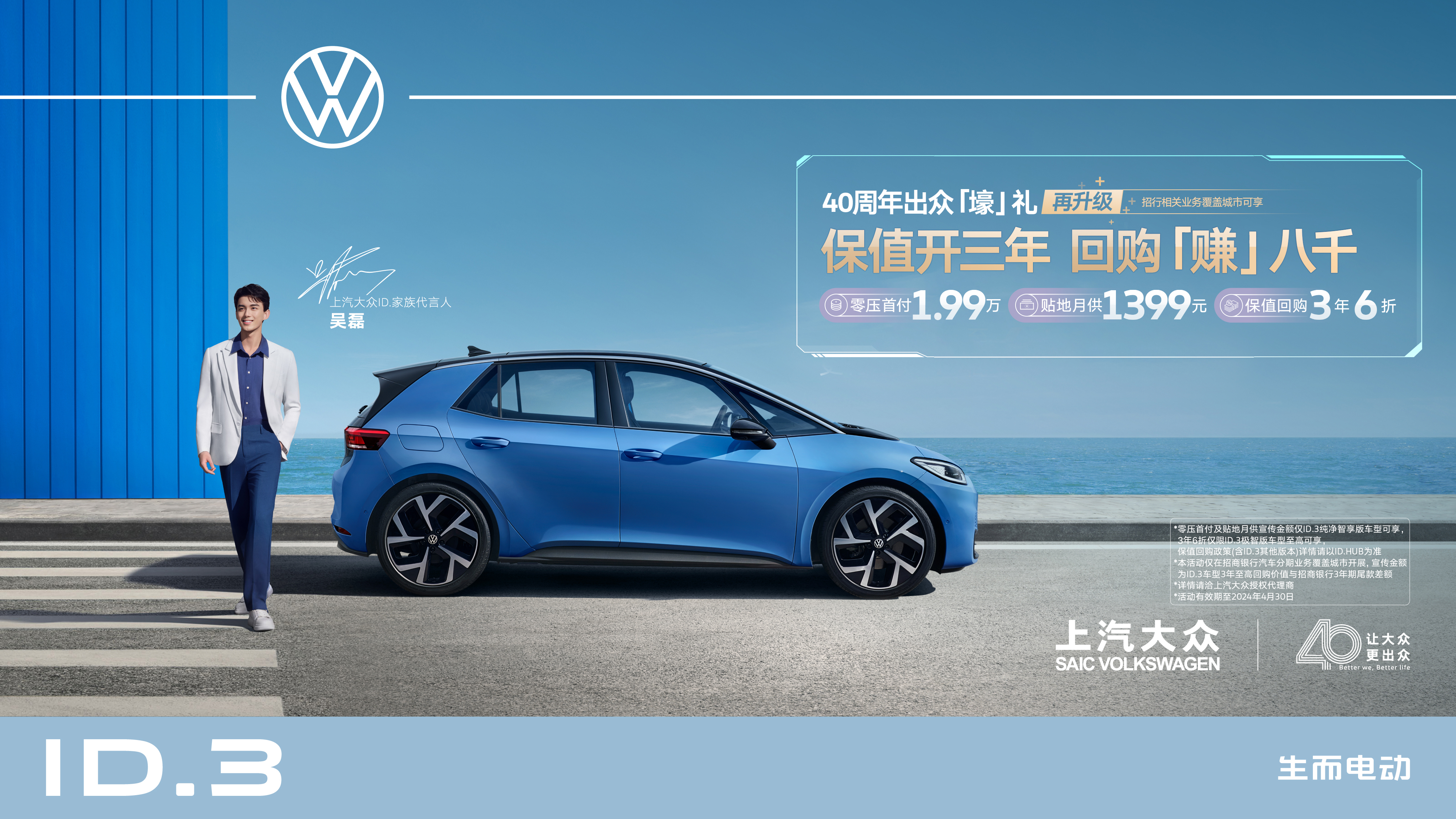 自3月初推出金融政策后,ID.家族的到店咨询量明显上升,终端市场呈现出回暖趋势。仅三周后,ID.3进一步“加码”40周年出众“壕”礼,登陆掌上生活-招商银行信用卡APP新能源专区。选择招行专享金融方案的用户,在1.99万起零压首付、1,399元起贴地月供、3年至高6折保值回购的基础上,用车3年后尾款可再减8,000元+,“电动国民神车”ID.3轻轻松松开回家。