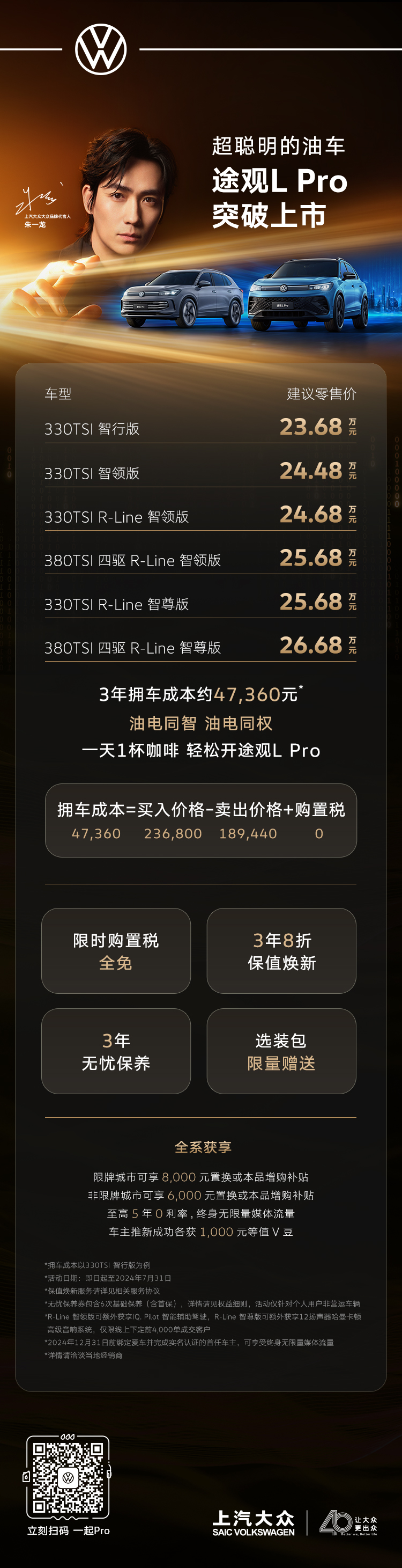 本届车展,刚刚上市的途观L Pro毫无疑问成为了全场焦点。当下,智能化已成为用户购车的重要考量因素,相比于电车,燃油车智能化的难度和成本更上一级,上汽大众重视油车市场用户需求,率先打破“油车与智能脱钩”的认知误区,推出“超聪明的油车”途观L Pro,带来“油电同智”新体验。新车建议零售价23.68万元-26.68万元,叠加给力的限时购置税全免、3年8折保值焕新、3年无忧保养以及选装包限量赠送等权益,途观L Pro三年拥车成本仅47,360元起,真正做到用车无忧,省上加省。