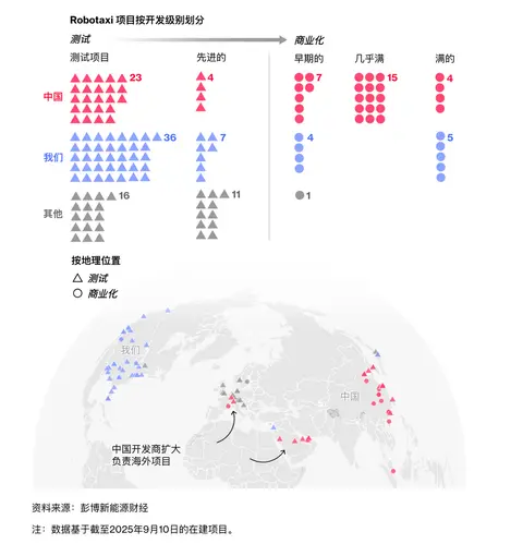 而与此同时,位于中国的无人驾驶车企却以惊人的速度迎头赶上,尤其是在市场需求、技术应用、供应链等方面的强大优势,已使中国的无人驾驶汽车在全球市场中占据一席之地。根据彭博新能源财经的分析,百度Apollo Go、WeRide和Pony AI等公司在自动驾驶出租车项目的数量上,已经超过了美国的同行。这些项目从初期测试阶段稳步迈向商业化,规模日益壮大。