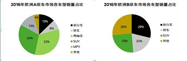 根据咨询公司IHS统计的2016年销量数据,旅行车在部分欧洲国家A B级车市的市场占有率高达30%。2016年,在欧洲A级车市场,旅行车的市场份额高于轿车;在欧洲B级车市场,旅行车的市场份额超过了SUV和轿车,终端销量令人瞩目。