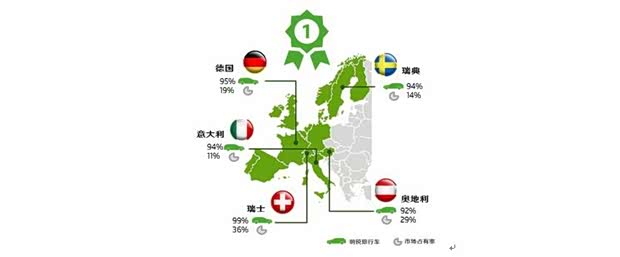 图中市场占有率指明锐旅行车在当地同级细分市场中的占有率;绿色车型百分比代表在当地销售的斯柯达明锐车型中,明锐旅行车所占的比重。