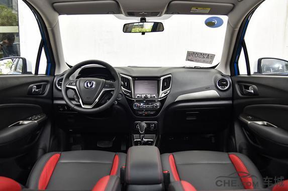 内饰方面,长安CS15延续了家族式的设计风格,整体显得比较简约。中控采用飞翼式的设计,加入了大量质感不错银灰色装饰面板;座椅采用红黑相间的设计,方向盘、扶手箱、车门包裹上都运用了一些红色缝线,突显运动;做工方面,依然保持着长安一贯的高水准。
