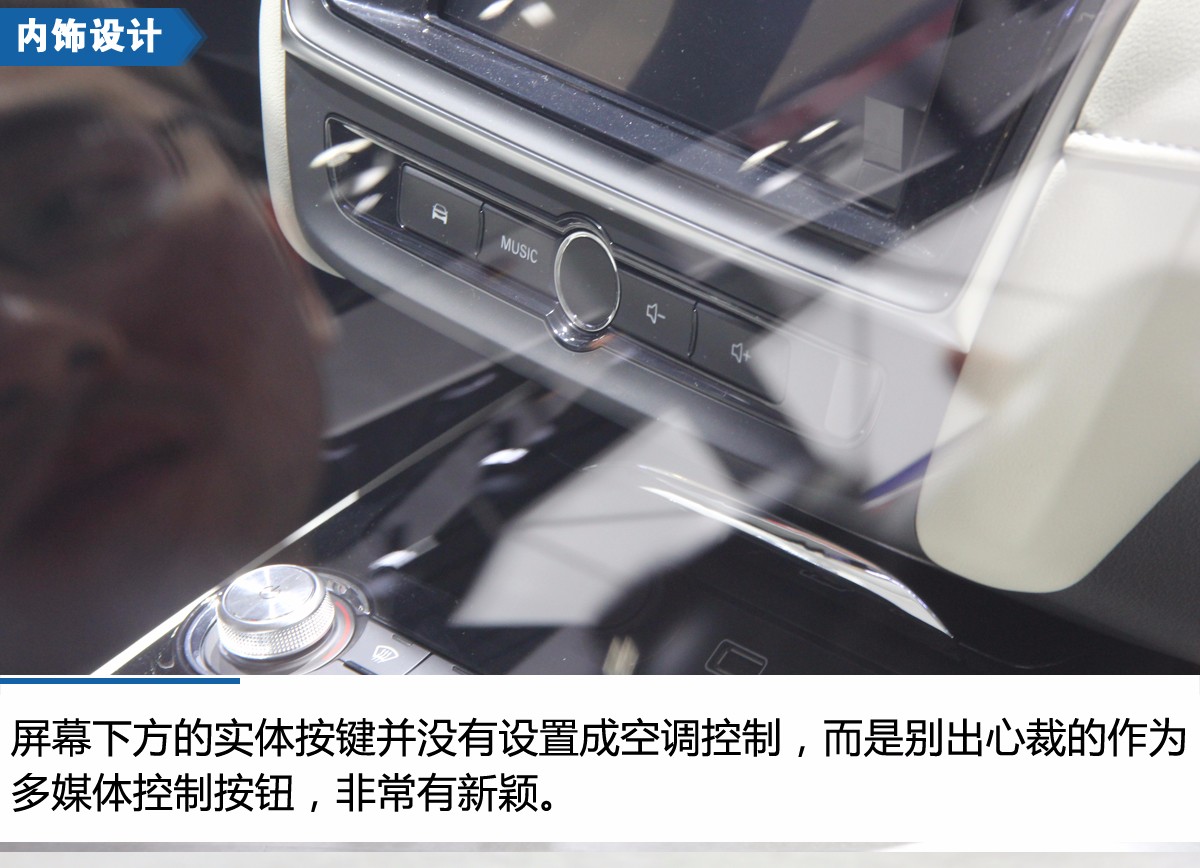 由于站台的限制,记者并未进入车内去拍摄,但是从外面看我们可以得出,Ei5在整体内饰设计布局上,保持了互联网汽车的特质。大屏触控,而且据了解上汽与阿里巴巴联合开发的斑马系统也会运用其中。