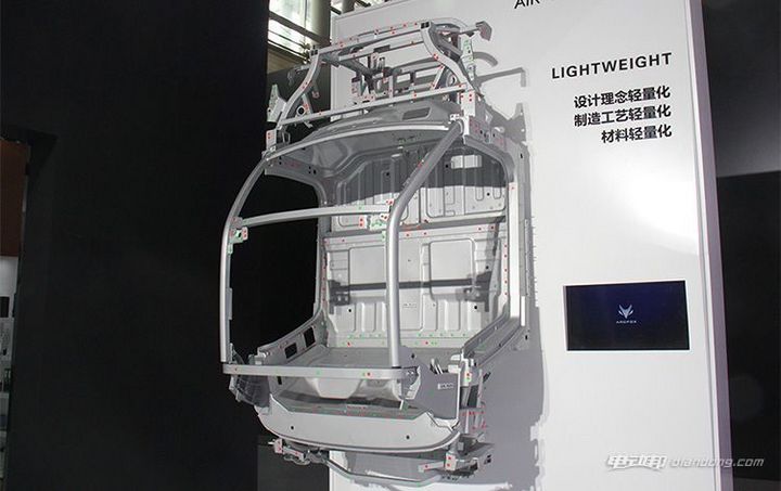 LITE与概念车ARCFOX-1一样,采用了全新铝合金框架式车身,单车用铝量超过160kg,占车身重量 54%,白车身较传统钢制车身减重30%,全车塑外覆盖件,顶盖部分则为复合材料。