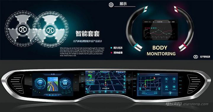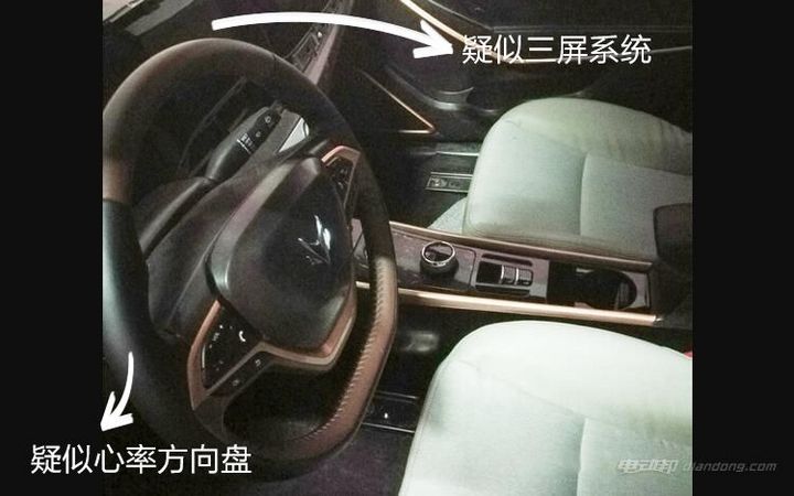 心率方向盘的显著特点是方向盘两端有传感把套,谍照图中有疑似部件,而多屏互联特点就是横贯左右的长条液晶屏,谍照中虽不清晰,但依稀可见中央屏幕形状,与示意图所示相仿。