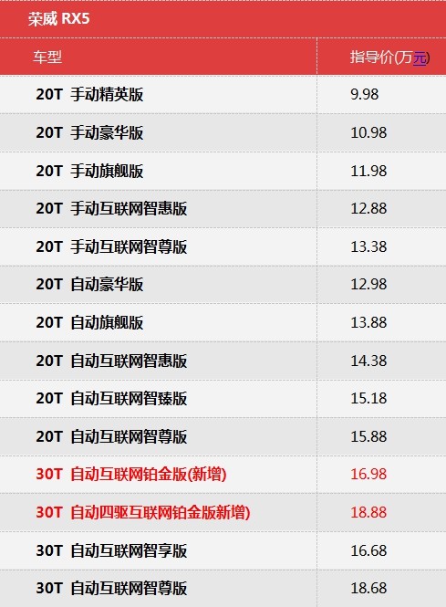 据了解,近日荣威RX5又推出两款新车型,新增30T两驱互联网铂金版和30T四驱互联网铂金版,运用律动设计Pro展翼格栅,配备矩阵式全LED大灯,搭载2.0T发动机,匹配6速双离合变速箱,而新车上市的官方指导价格区间为16.98万-18.88万。