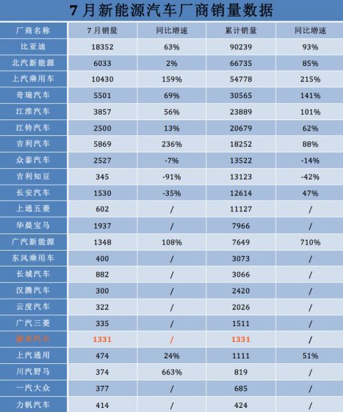7月份上汽乘用车暴涨159%,以10430赶超北汽新能源来到亚军位置,前7月销量也达到了54778辆,与北汽新能源差距缩到了将近一万二千辆。广汽新能源起步较晚,销量基数较小,但现如今传祺新能源车型已经逐渐入侵市场,数据显示广汽传祺GS PHEV 7月份同比增长4986%,数据虽然比较“奇葩”,这也可以看出广汽开始在新能源方向发力。