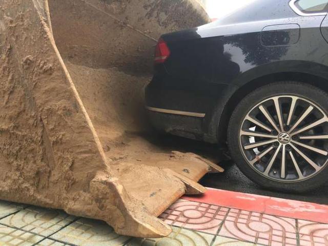 没错,把这辆黑色大众围堵起来的可不是一般车辆,而是两辆巨型挖土机。从黑色大众的侧面图片可以看出,这辆黑色大众被挖土机正好堵住的去路,因为挖土机都有一副大铲子,正好可以把这辆黑色大众包裹起来。