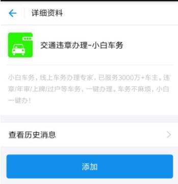 打开支付宝,搜索:违章查询小白车服务,如图